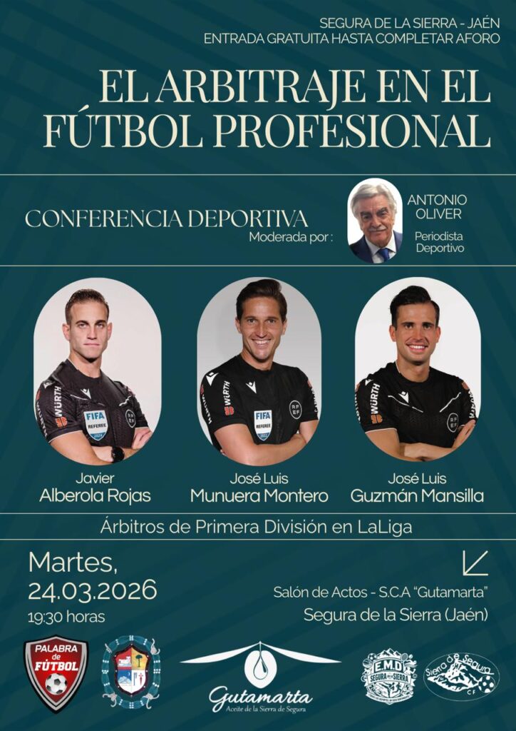 El próximo martes 24 de marzo va a tener lugar en la localidad jienense de Segura de la Sierra uno de esos encuentros para reunir a tres árbitros de Primera División que, en cada caso, está respaldados por una trayectoria brillante. El acto cuenta con el respaldo del Ayuntamiento de Segura de la Sierra y con la colaboración de su EMD y del club Sierra de Segura FC, así como la de la SCA Gustamarta, en cuyo salón de actos se va a desarrollar este evento.